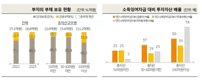 한국부자는 '소득잉여자금', '부채활용', '자산배분 전략'으로 부를 키우고 있다고해요. 부자들은 벌어들인 돈의 어느 정도를 재투자할까 궁금했었는데, 이 보고서에 아주 명확히 나와 있었습니다. 부자들은 연평균 8,825만원의 소득잉여자금(투자가능자산 = 연간소득-지출)을 다시 투자하며 자산을 불려나갔다고 합니다. 연평균 8,825만 원이라면 월 735만 원인데, 잉여 자금이 저 정도라니!! 아무튼, 자산 규모별로 소득잉여자금이 달랐는데, 총 자산 50억 원 미만은 연 6,999만 원, 그러니까 월 583만 원을 잉여자금으로 재투자에 사용하고 있었고, 50억원~100억원 미만은 1억 174원, 100억 원 이상은 9,931만 원을 재투자에 사용하고 있었습니다.