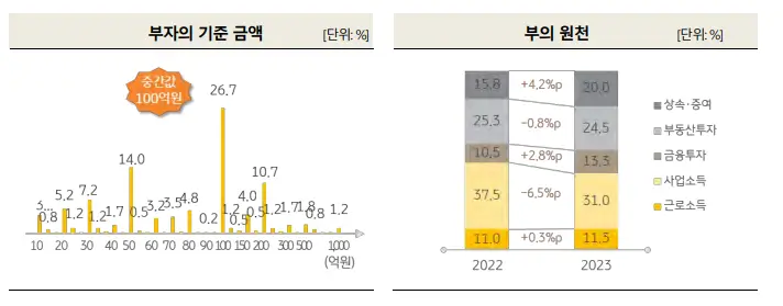 한국 부자들이 생각하는 부자의 기준은 무엇일까요? 한국 부자들은 금융과 부동산 등을 포함한 총자산이 100억원 이상은 되어야 부자라고 생각한대요. 그럼 이들은 어떻게 자산을 형성했을까요? 보고서에 따르면, 이들의 부의 기원 중 가장 큰 부분을 차지하는 것이 '사업소득(31%)'이었다고 해요. 이에 비해 근로소득은 약 11% 차지했다고 합니다. 상속과 증여 등으로 부자가 된 경우도 20% 정도로 여전히 높은 비중을 차지했고요. 최근에는 고소득 전문직이 근로소득과 투자로 금융자산 10억 원 이상의 부자에 진입하는 경우가 늘어나는 것으로 파악된다고 합니다.