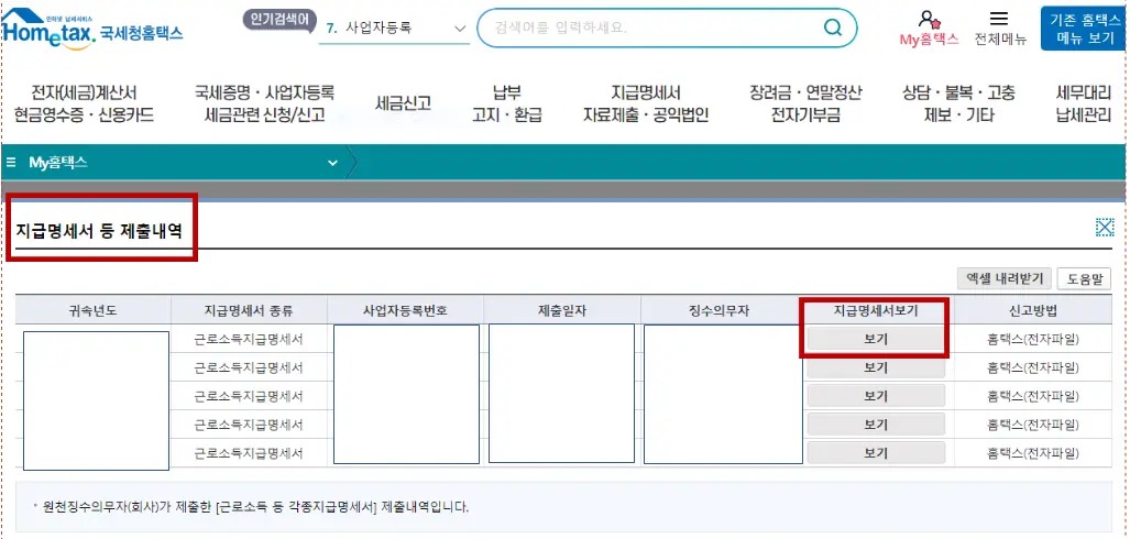 로그인을 하게되면, '지급명세서 등 제출내역'이 뜨게됩니다. 이것은 여러분의 회사가 여러분에게 월급을 줄 때, 얼마를 줬는지 제출한 것입니다. 그래서 사업자 등록번호에는 여러분이 다니는 회사의 사업자번호가 뜨게되고, 징수의무자에도 여러분이 다니는 회사의 명칭이 나오게 되죠. 여러분이 세전 소득과 세액을 확인하기 위해서 해야할 것은 <지급명세서 보기>의 보기를 클릭하는 것입니다.