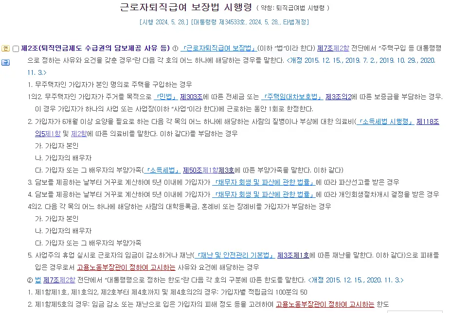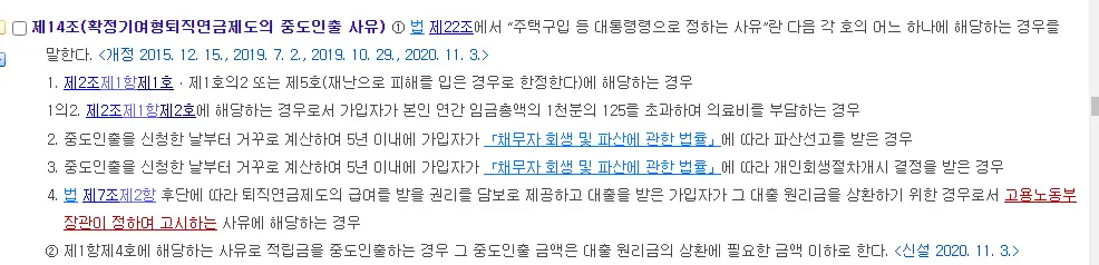 아무 때나 중도인출이 가능한 연금저축(단, 과세이연, 저율과세 효과 사라짐)과 달리, IRP는 원칙적으로 중도인출 불가하며, 단지 법에서 정한 예외사유일 경우에만 중도인출이 가능하다. (아래 사진 : 근로자퇴직급여보장법 시행령 참고)