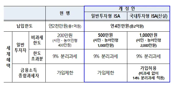 기존에 금융소득종합과세자는 ISA 계좌를 가입할 수 없었다. 그러나 이번 세법 개정안으로 국내투자형 ISA가 신설되면, 금융소득종합과세자도 국내투자형 ISA 가입할 수 있게 된다. 다만, 금융소득종합과세자가 국내투자형 ISA에 가입할 경우, 비과세 혜택은 없고, 14% 분리과세만 적용되니 이점은 꼭 알아두어야 한다. (비과세 혜택은 없더라도 분리과세 혜택을 볼 수 있으니 절세에 유리한 점이 있다.)