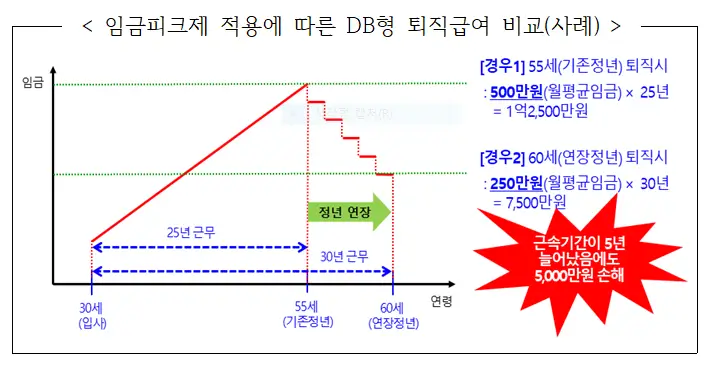임금피크제는 일정연령, 근속시점 등을 기준으로 근로자의 임금을 조정하는 대신, 소정의 기간 동안 고용을 보장하는 제도이다. 만약 입사할 시점에 30세였고, 본래의 정년시점이 55세라면, 60세까지 정년을 연장하여 고용을 보장하는 대신, 연장된 5년의 시간 동안 임금을 조금씩 줄여나가는 것이다. DB형 가입자의 경우 퇴직급여액은 '계속근로연수*퇴직 전 3개월간 월 평균임금'으로 결정되기 때문에, 정년이 연장된 시점인 60세에 퇴직급여액을 받게되면, 퇴직전 3개월간 월평균임금이 적은 수준에서 결정된다. 그러면 총 퇴직급여액도 줄어들게 되므로, 임금피크제를 앞둔 DB형 가입자라면, 임금피크제 적용 직전에 DC형으로 전환하여 퇴직급여를 수령하고, 이후 퇴직할 대까지는 DC형으로 운영하는 것이 가장 유리하다. 이렇게 DC형으로 전환한 이후에는 자산의 운용 주체가 자신이므로 자신이 운용 책임을 부담한다.