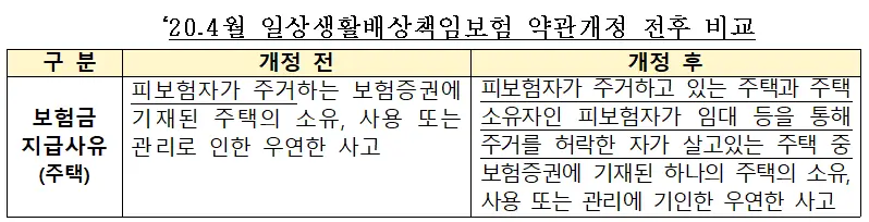 '20.3.31일 이전에 가입한 경우라면 보상받을 수 있는 조건은 피보험자가 소유하고 거기에 거주해야 한다. (소유&거주 요건) 그러나 '20. 4.1 이후에 가입한 경우라면, 피보험자가 해당 주택에 거주하지 않더라도 소유만 해도 손해를 보상받을 수 있다. (소유 only 요건) 그러니 내가 소유했지만 거기 살지 않고 임대준 주택에서 누수가 발생한 경우라면, '20.4.1 이후에 가입한 경우는 보상을 받을 수 있고, '20.3.31일 이전에 가입한 경우는 보상을 받을 수 없다.