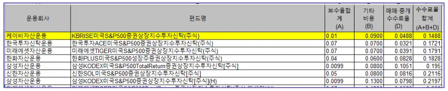 블로그 포스팅 발행일(25.1.8) 기준으로, 가장 수수료율이 낮은 것은 케이비자산운용에서 운용하는 KBRISE미국 S&P500이었다.