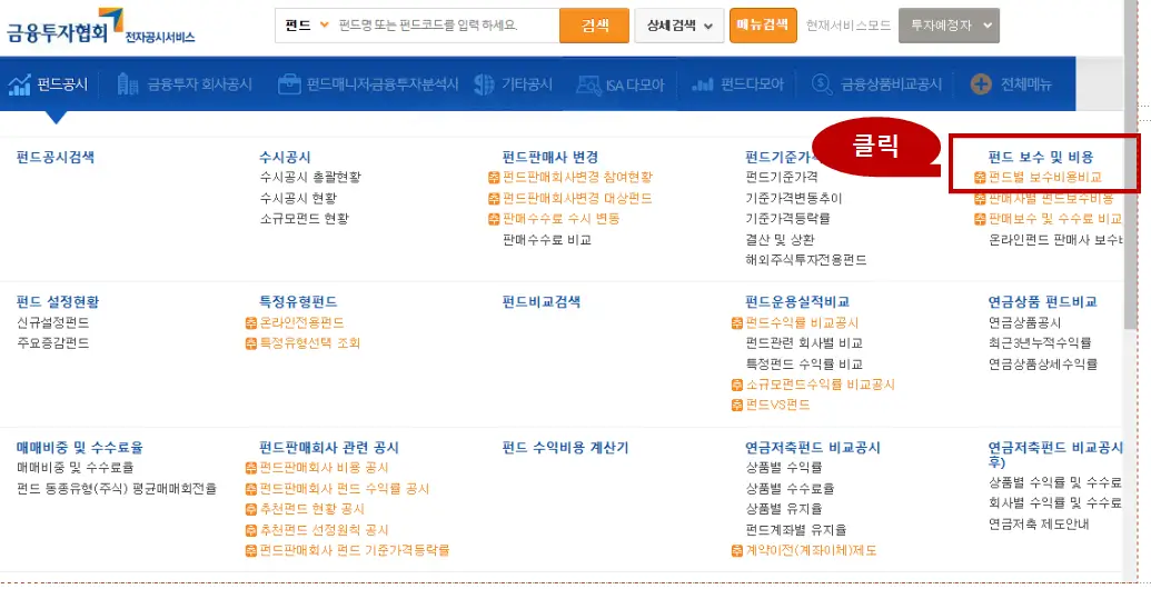 금융투자협회 전자공시 서비스 화면을 보면, 오른쪽 상단에 '펀드 보수 및 비용'이라는 배너가 있다. 이 배너에 커서를 갖다 대면, 나오는 '펀드별 보수 비용 비교'를 클릭한다.