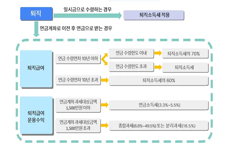 퇴직급여(퇴직금, 퇴직연금)를 일시금으로 받을지 연금으로 받을지 고민이 될 수 있다. 퇴직급여는 일시금으로 받는 것보다 연금으로 받는 것이 세제 혜택이 더 좋다. 이것은 이전 포스팅에서 다루었으니, 이전글을 참고하시길 바란다.